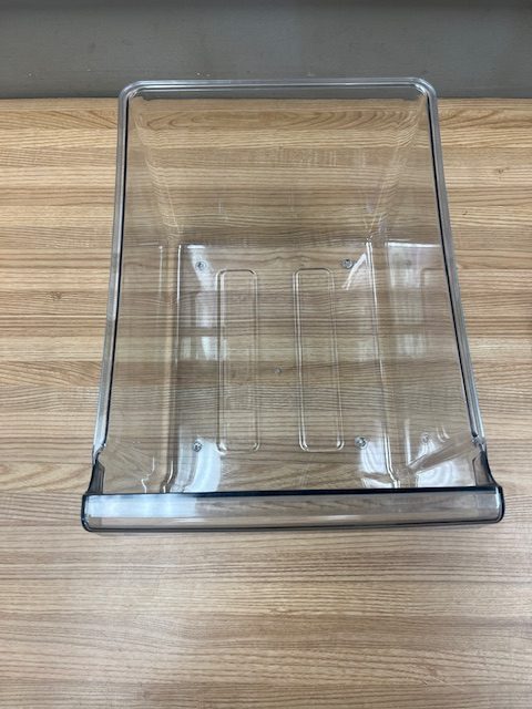 This crisper drawer is clear in colour. The crisper drawer stores fruits and vegetables.