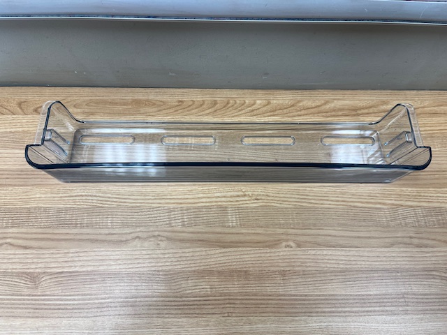 This door shelf bar is clear in colour. The door shelf trim snaps into place on the door to hold items on the door shelf. This door bar is normally found in the freezer section.