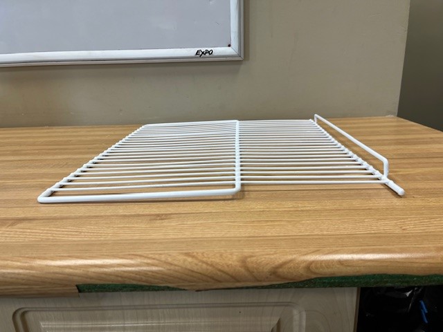 White wire shelf. Shelf placement is adjustable in the Fridge.