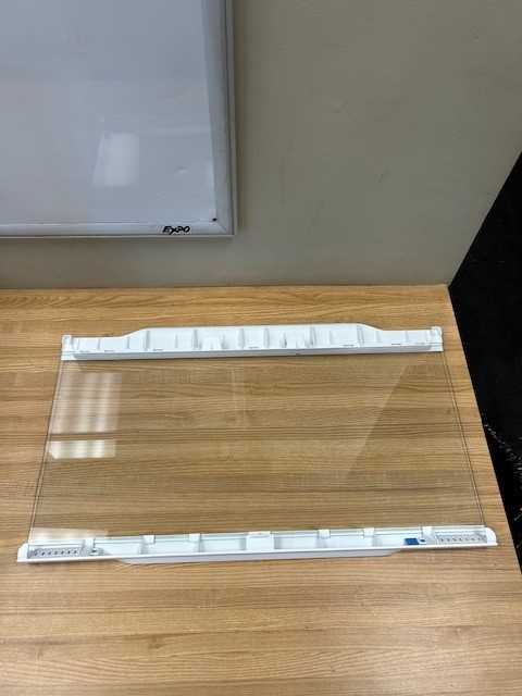 This is the frame that is above the Crisper Drawers in a Refrigerator. The cover is glass with a white trim made of plastic at the front and back. Contains 2 humidity controls.