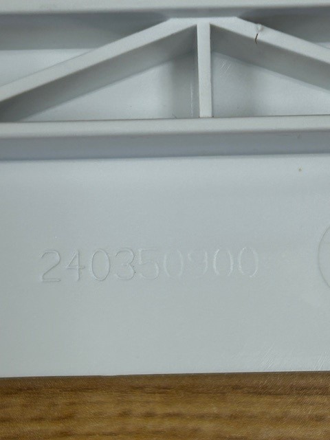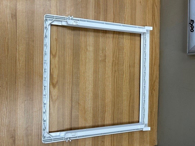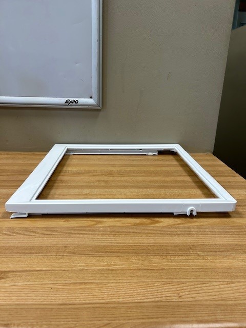 The Crisper Cover Frame is a white plastic trim, with a Rail that holds the Lower Crisper Drawer (P# 240351207) in place . This particular Crisper Cover is found in the Lower position on the Fridge side of a Side x Side Fridge.