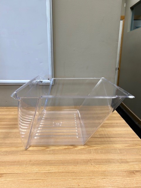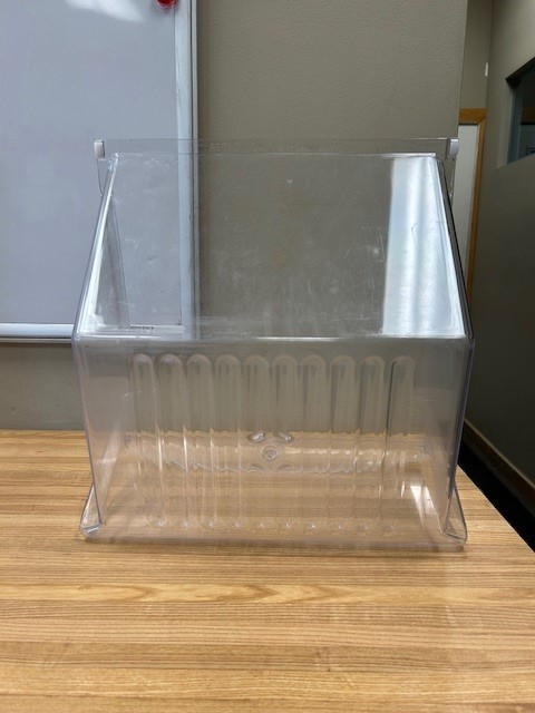 The Crisper drawer is a Large drawer in fridge compartment that is used to store vegetables and Fruit. This particular Crisper Drawer is found in the lower position on the Fridge side of a Side x Side Fridge. Clear crisper drawer.