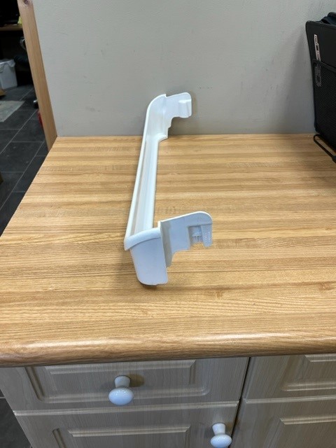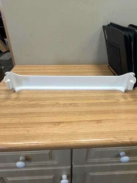 This door shelf is white in colour. The door bin attaches to the inside of the refrigerator door and typically holds jars and bottles. 22-1/2″ x 5″.