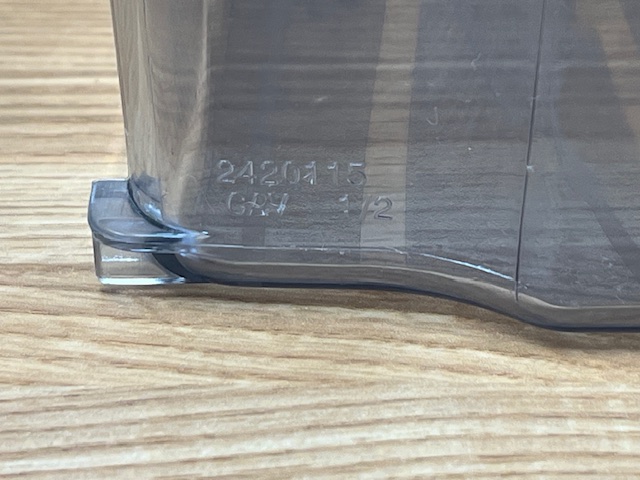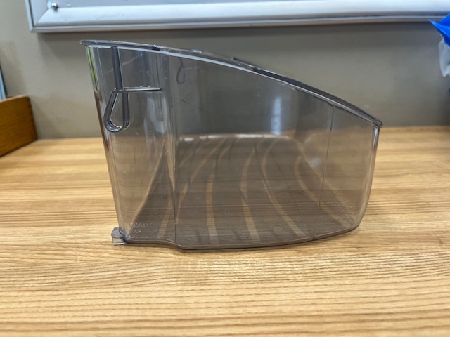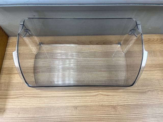 This plastic bin is clear in color (Some of the bins will be light, others will have a darker tint to them). The door bin attaches to the inside of the refrigerator door and typically holds jars and bottles.