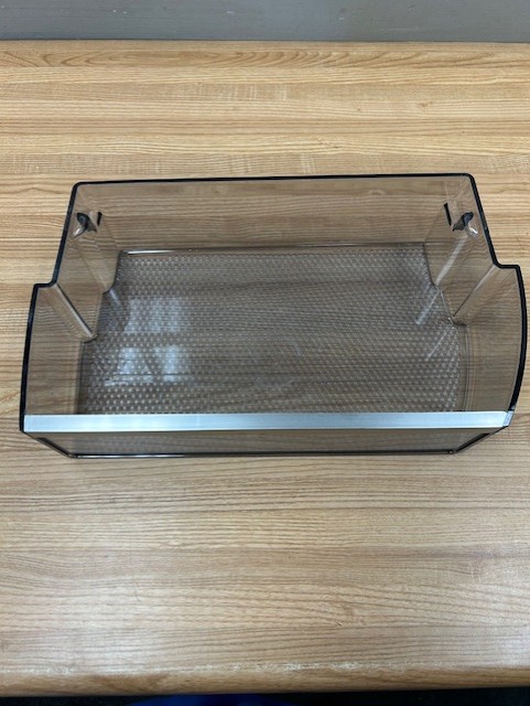 This plastic bin is gray/clear in color with a silver trim.  The door bin attaches to the inside of the refrigerator door and typically holds jars and bottles. This bin is typically found on a French door Fridge on the right Door.
