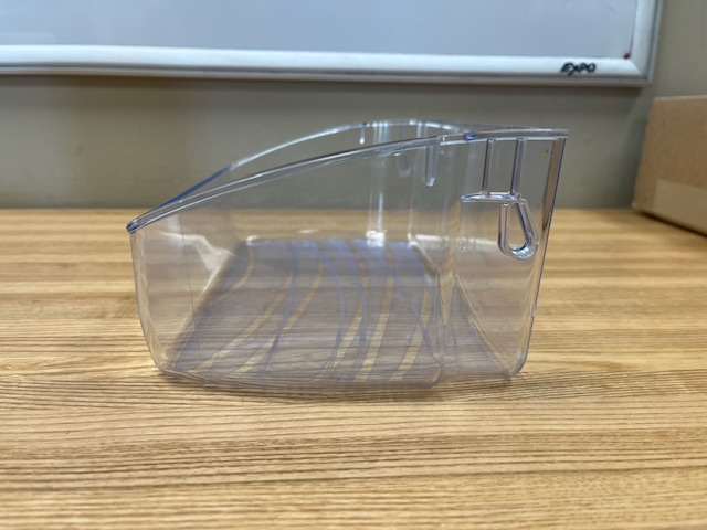 This plastic bin is clear in color (Some of the bins will be light, others will have a darker tint to them). The door bin attaches to the inside of the refrigerator door and typically holds jars and bottles.