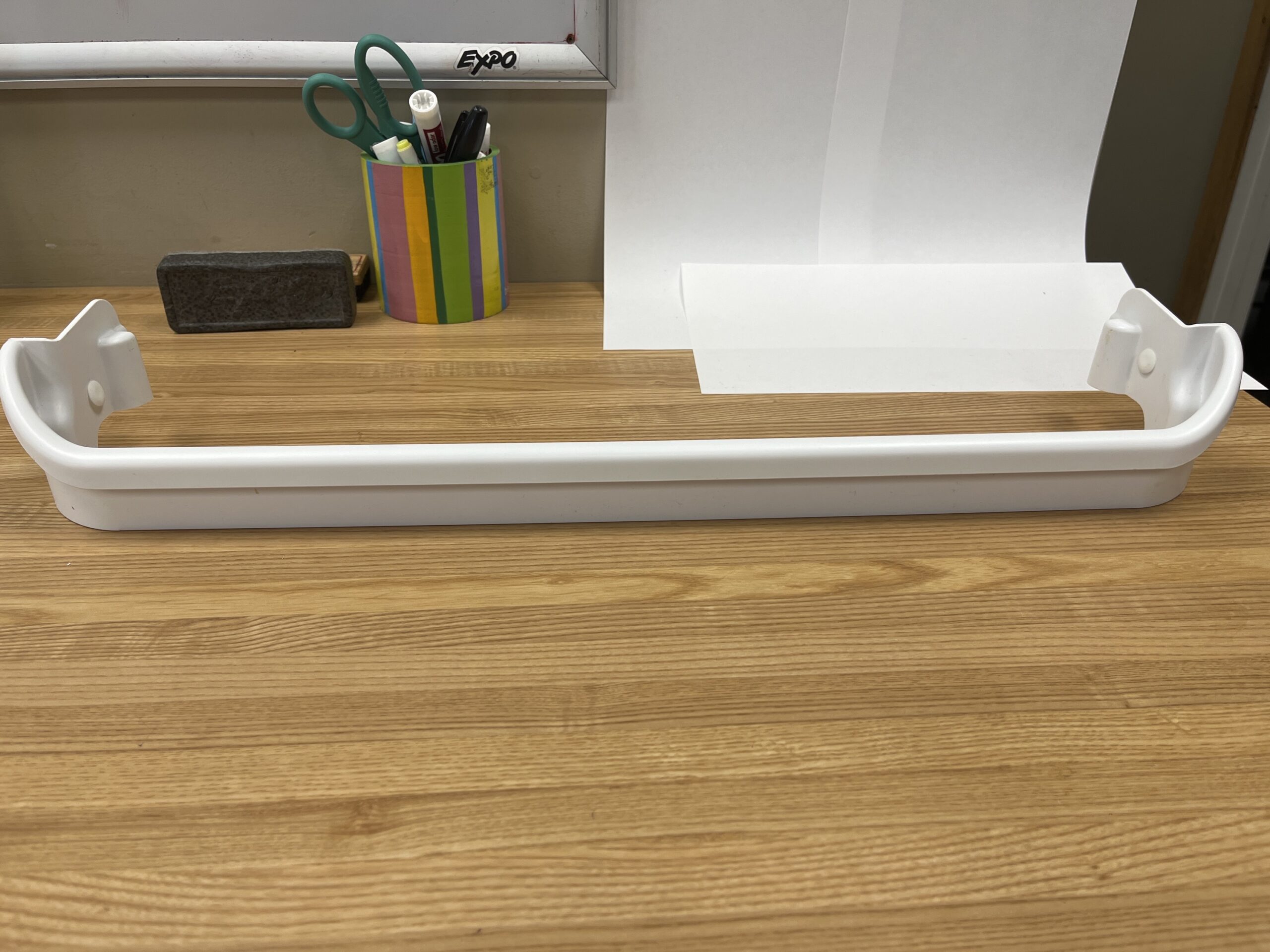This bar is 23″ long x 3″ high. Frigidaire genuine refrigerator Door Shelf Bar. This door shelf bar is white in colour. The door shelf trim snaps into place on the door to hold items on the door shelf. This door bar is normally found in the Fridge section of a 15-17 cu.ft. (28″ wide) fridge, in the bottom bar position.