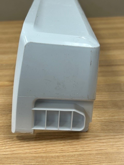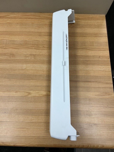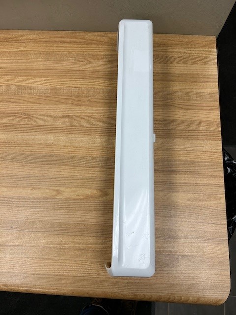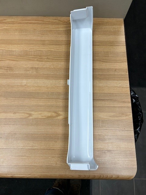 This door shelf is White in colour. The door bar attaches to the inside of the Fridge door, this is the Bottom bar on the door. Width 21 1/4″, Depth 4 3/8″, Height 3 1/2″