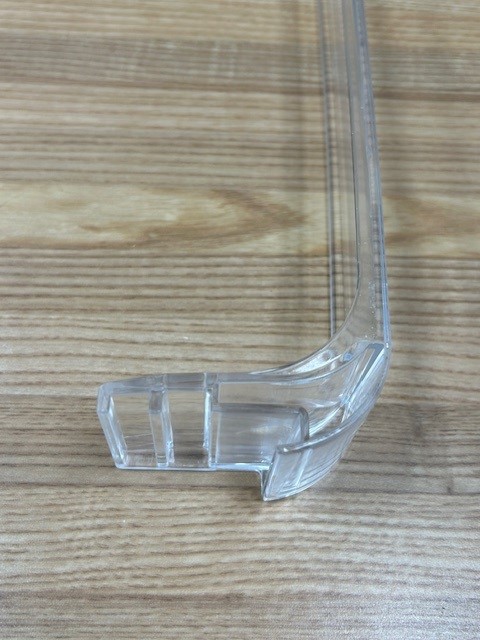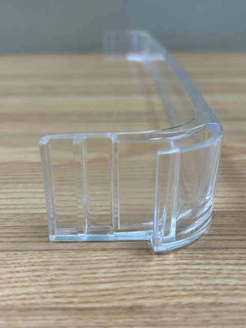 This door shelf is Clear in colour. The door bin attaches to the inside of the refrigerator Freezer door . 18 3/4″ Wide. Found in a 24″ wide Fridge, with top mount freezer.