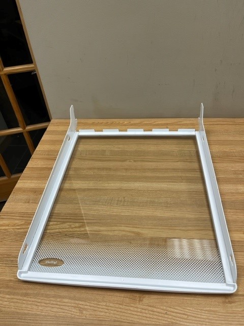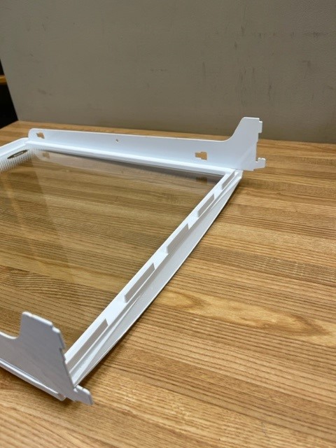 Glass Shelf with a White Trim. Shelf would attach to a Rail on the Back of the Fridge. This shelf is usually found in a side by side refrigerator in the fresh food section (wider side of the fridge).