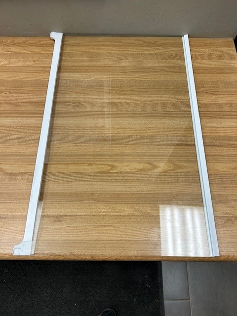 Glass shelf, with white Trim at the front and back. Shelf placement is adjustable in the Fridge. Shelf is the full width of the fridge.