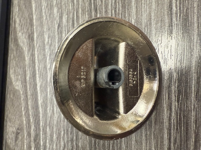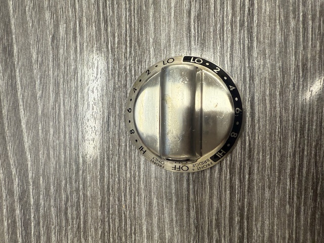 This control knob is stainless in color and is made of metal with black markings for a Bridge element. This part lets you control the heat of the surface burner on the range.