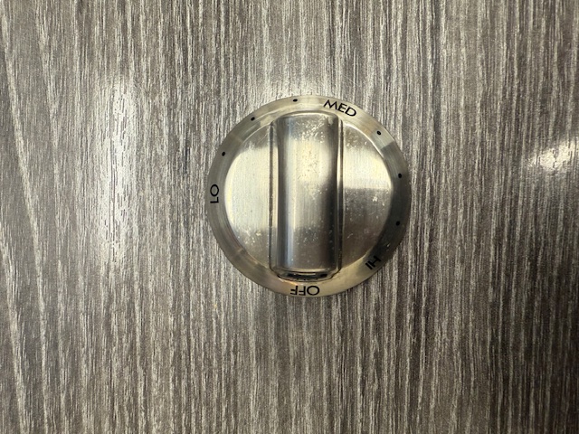 This control knob is stainless in color and is made of metal with black markings for a warming element control. This part lets you control the heat of the surface burner on the range.