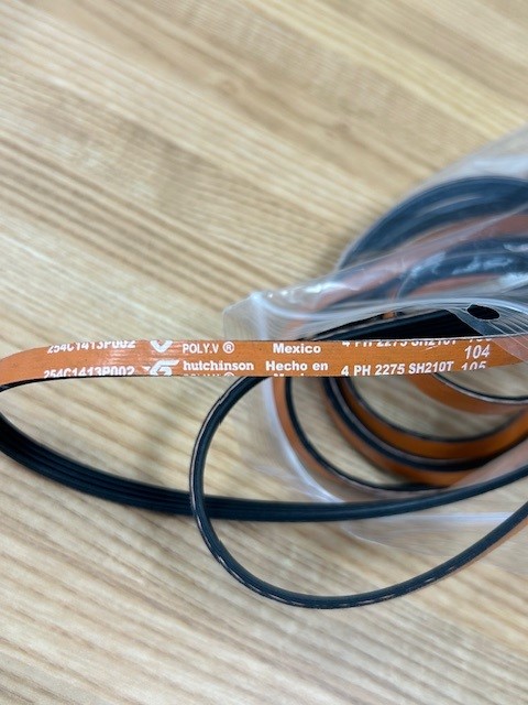 The drum belt attaches to the motor pulley and spins the drum as the motor rotates. This drum belt is flat and has 4 ribs and 3 grooves. This drum belt is approximately 89-1/2″ long.