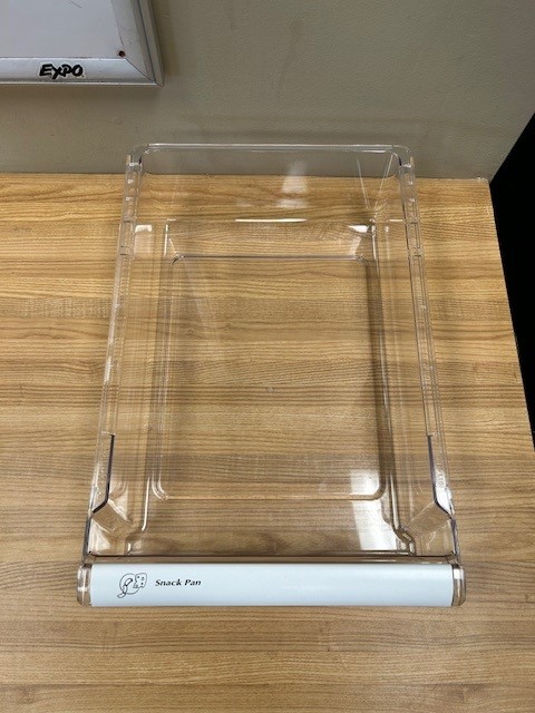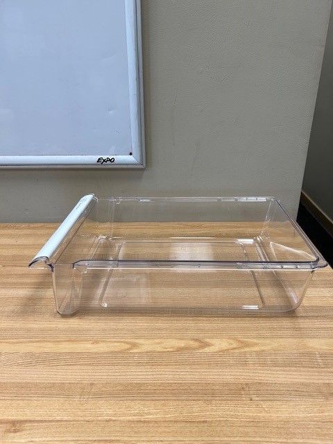 Drawer is clear in color with a white trim on the handle. This part is also referred to as a meat drawer, or fresh foods drawer.