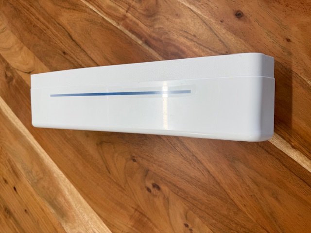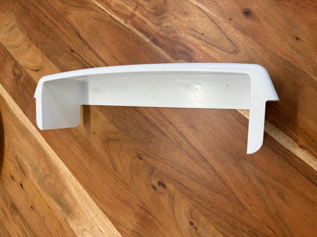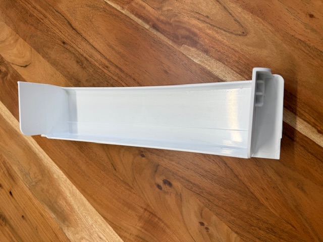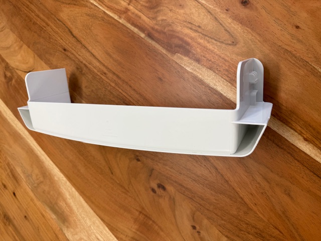 This door bar is white in color. The door bar snaps into place on the fridge door to hold items on the door shelf. Removed from the fresh food section of a Side x side Fridge.