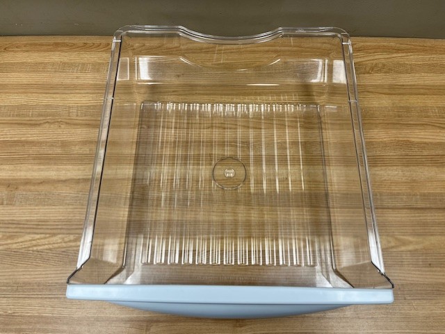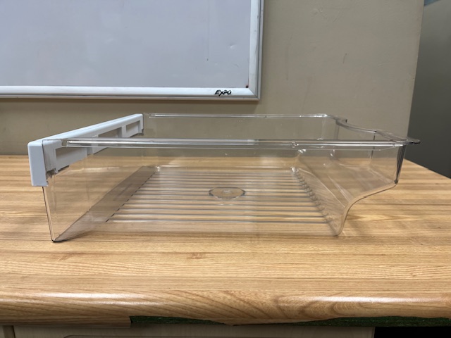 The drawer is a compartment that attaches to on the of the Glass Shelves in the Fridge. This particular Drawer is found in the upper position on the Fridge side of a Side x Side Fridge.