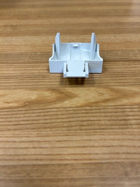 Door Shelf End Cap. This end cap is white in colour. These end caps hold the bottle bar in place on the Fridge Door. 2 required for each Bar, same end cap for left and right side.