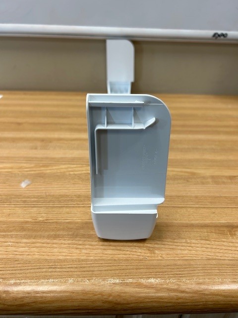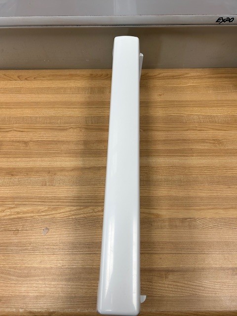 This door bar is white in colour. The door bar snaps into place on the freezer door to hold items on the door shelf.