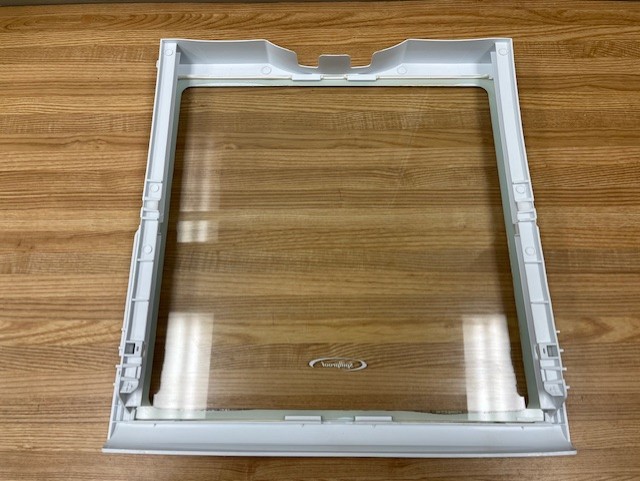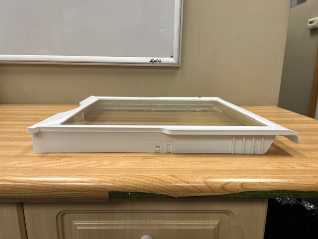 Glass shelf, with white Trim. Shelf placement is adjustable in the Fridge.