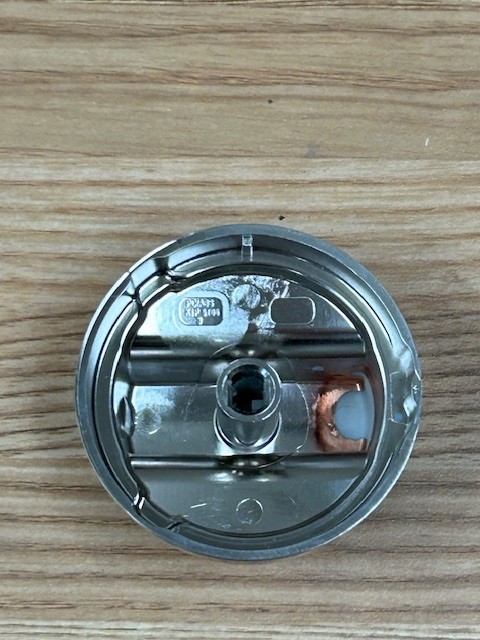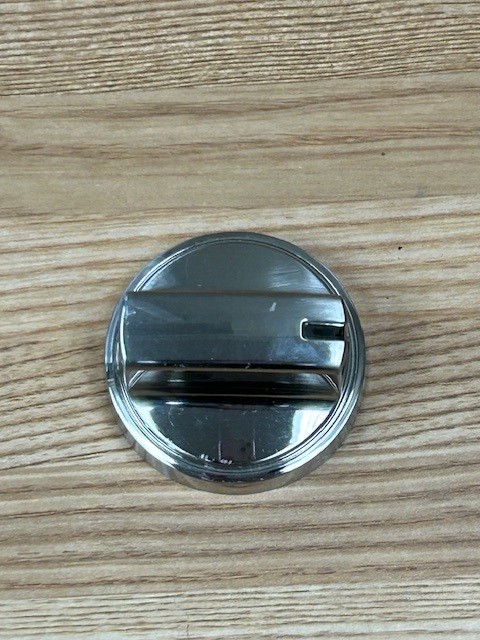 This control knob is silver in color and made of plastic. The knob turns the burner control that powers the heat of the surface burner on your range.