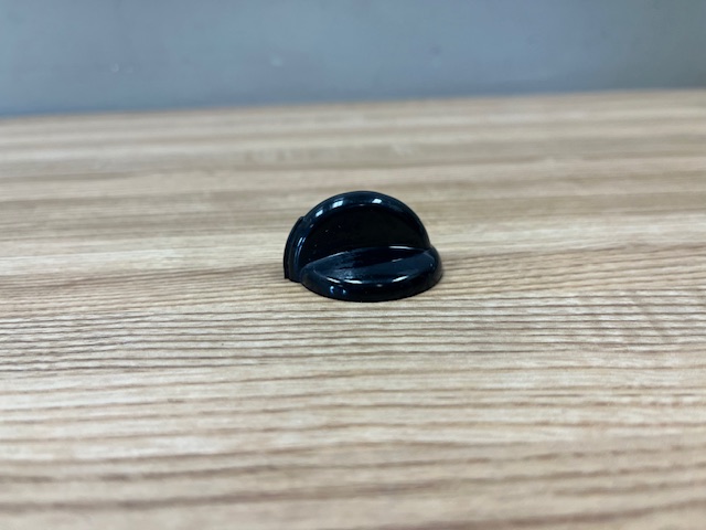 This control knob is plastic and black in color. The knob turns the burner control that powers and allows you to control the heat of the surface burner on your range.