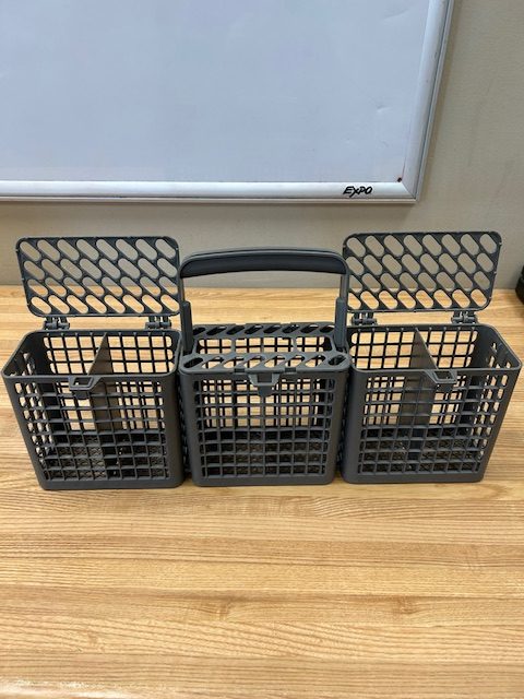Light Grey in color. This part is also known as a silverware basket. Sits in the Lower Dishrack and holds utensils for washing.
