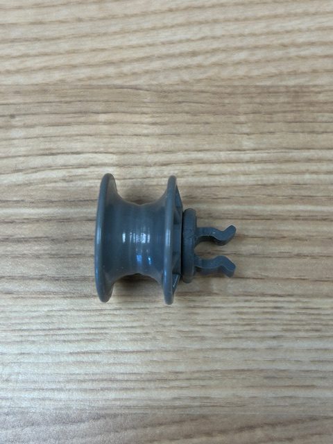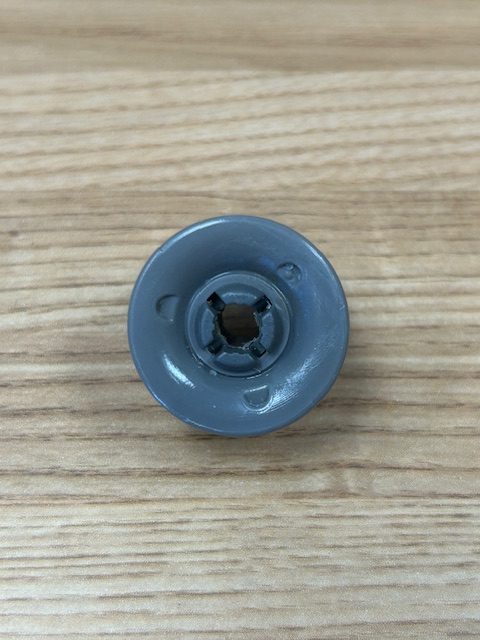 Dark Grey in color. This part is also known as a rack roller, dishrack wheel, or dishrack roller, carrier roller. This Roller wheel attaches to the Dishrack allowing the rack to be moved in and out.