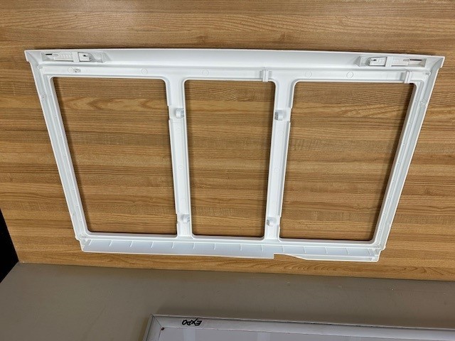 This is the frame that is above the Crisper Drawers. This Crisper cover is for a fridge with 3 crisper Drawers. The Frame is Plastic and contains 2 plastic humidity controls which are being sold with the Crisper Cover. Crisper cover Glass insert is sold separately (P# MHL42613217). Width 28 3/4″ Depth 19″