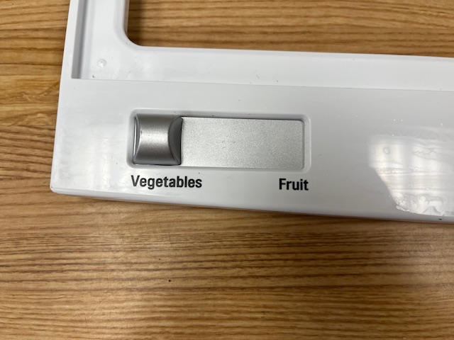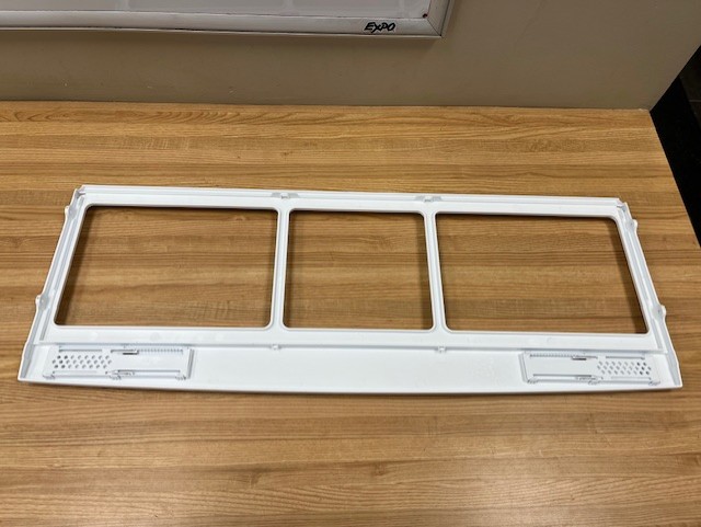 This is the frame that is above the Crisper Drawers. Frame is Plastic and contains 2 plastic humidity controls (P# MFF620436) which is being sold with the Crisper Cover. Crisper cover Glass insert is sold separately (P# MHL42613281). Width 31 1/2″ Depth 12″