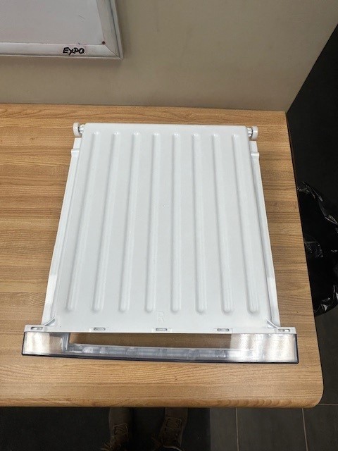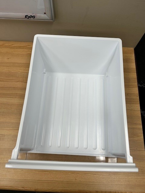 White Crisper Drawer with Clear front found in a 32-33″ wide French Door Fridge. Also known as Drawer, Fruit and Vegetable trays, Vegetable drawer. This would be the Right side crisper drawer.
