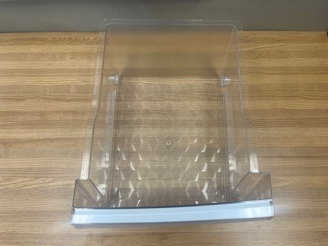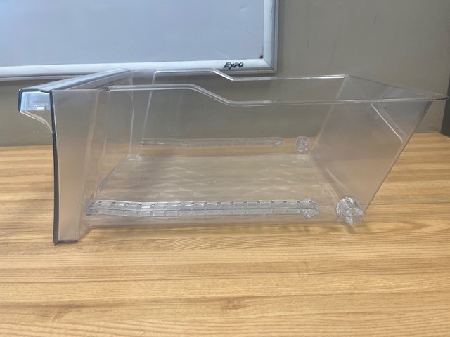 Clear Crisper Drawer with white trim. Also known as Drawer, Fruit and Vegetable trays, Vegetable drawer. This would be the Right side crisper drawer.