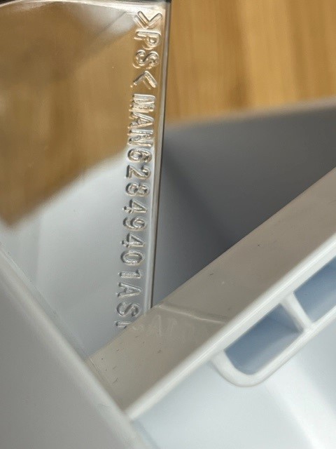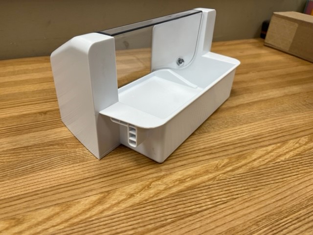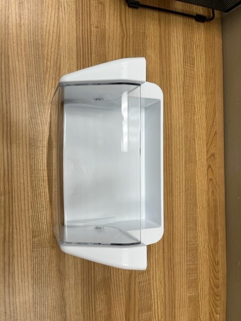 Refrigerator Door Bin with clear Dairy Door, which moves open and closed. White with Clear front. Found in 30″ French door Fridge about 21-22 cu.ft. in capacity.