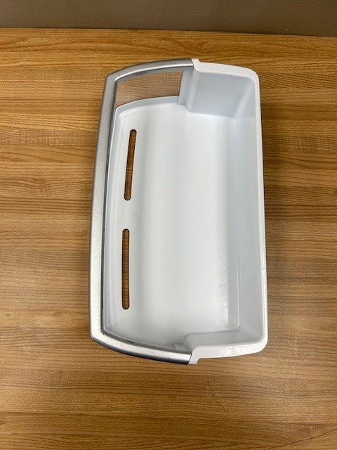 Refrigerator Gallon Storage Door Bin. White with Clear front with Silver trim. Width 14″ (35.5cm), Depth 7 3/4″ (9.5 cm), height 3 3/4″ (9.5cm)
