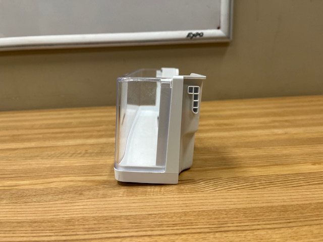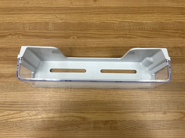 Refrigerator Door Bin. White with Clear front and no trim. Found in a 36″ French Door Fridge on the left door.