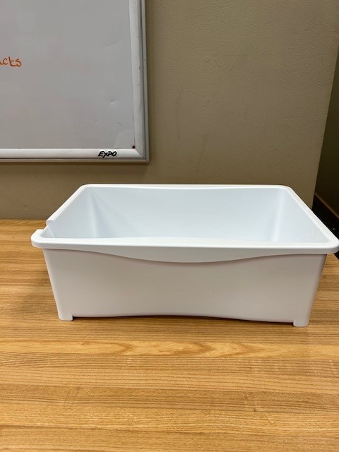 Ice bin found in the Pull out Drawer in the Freezer section of a 30″ wide French Door Fridge. The ice maker in the Freezer section of the Fridge would make Ice and dump it into this bin . Also known as an Ice Bucket or Ice Container.