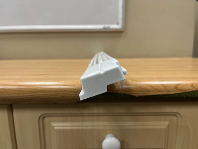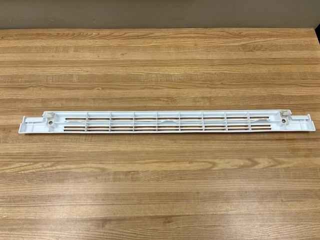 This kickplate is white in colour. The kickplate attaches across the bottom of the refrigerator and allows air to flow into the machine compartment to cool the condenser.