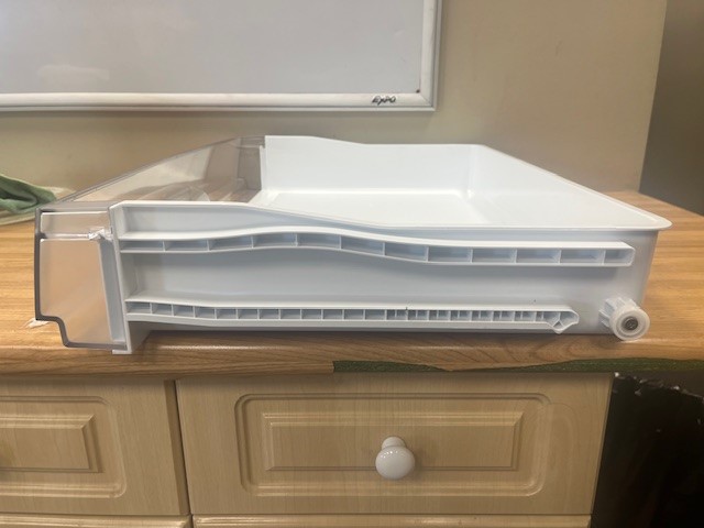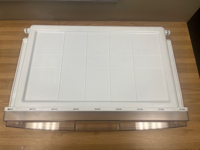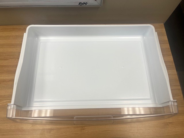 White Large pantry Drawer with Clear front found at the bottom of the fridge section of the French Door Fridge. Also known as Large Deli Drawer or Glide N’ Serve Drawer.