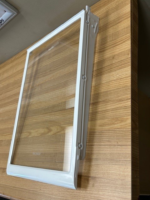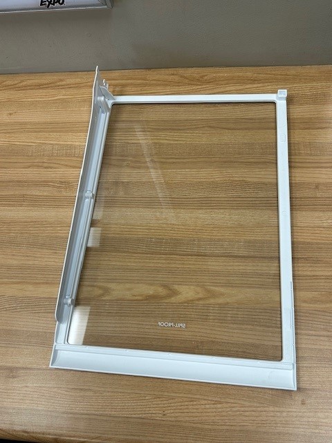 Refrigerator glass shelf with white trim. Shelf would cover half the width of the inside of the fridge and can be adjusted to different levels in the fridge compartment. This shelf is for the Left side of the fridge only. There is one support attached to the Shelf on the Right side only, the Left side of this Shelf would sit on the trim on the Liner of the Fridge. Also see Shelf Assembly for the Right Side P# AHT73595407 (Sold Separately).