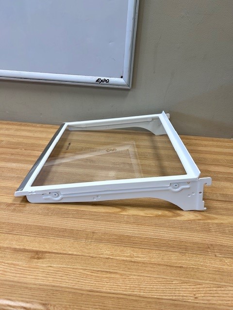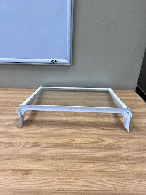Refrigerator glass shelf with white and silver trim . Shelf can be adjusted to different levels in the fridge compartment. Also known as Spill Protector shelf.