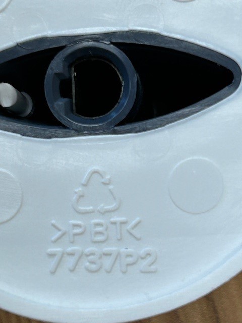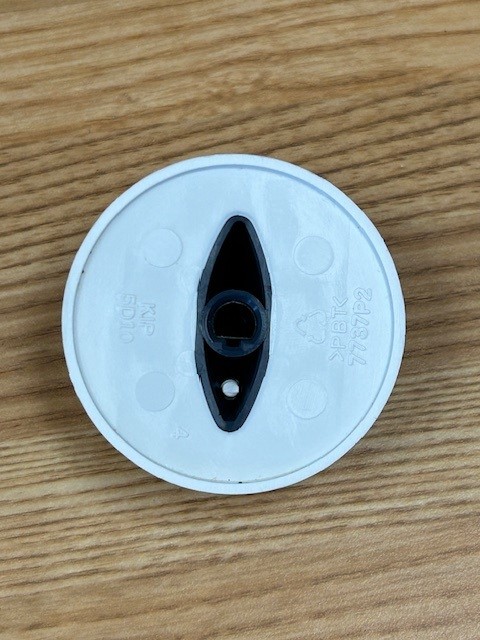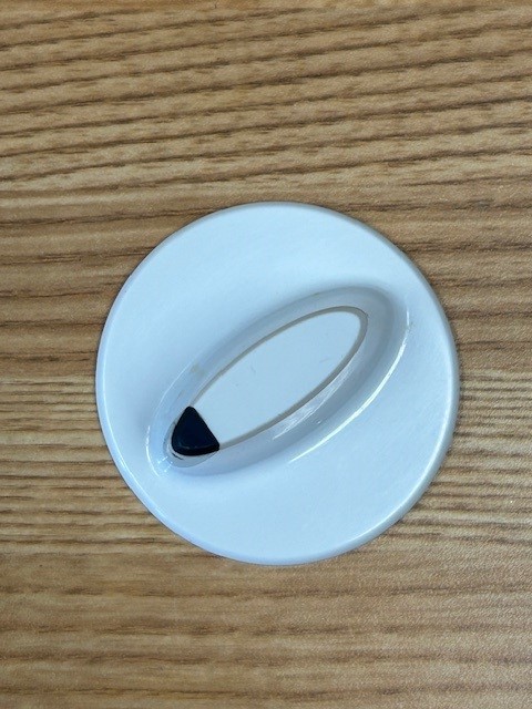 Description: This control knob is white in colour with navy details. The knob turns the burner control that powers the heat of the surface burner on your range.