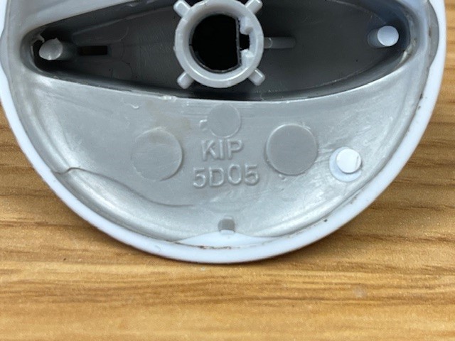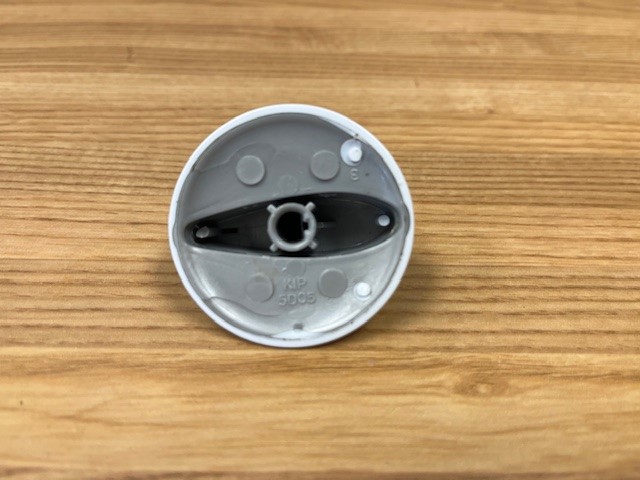 This control knob is white in colour with grey details. The knob turns the burner control that powers the heat of the surface burner on your range.
