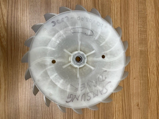 Blower Wheel – Internal Part. The blower wheel spins on the motor shaft to blow air through the dryer drum and out through the exhaust. Dimensions (Approx.) Width: 8 1/2″  Depth:  8 1/2″ Height: 3 1/4″