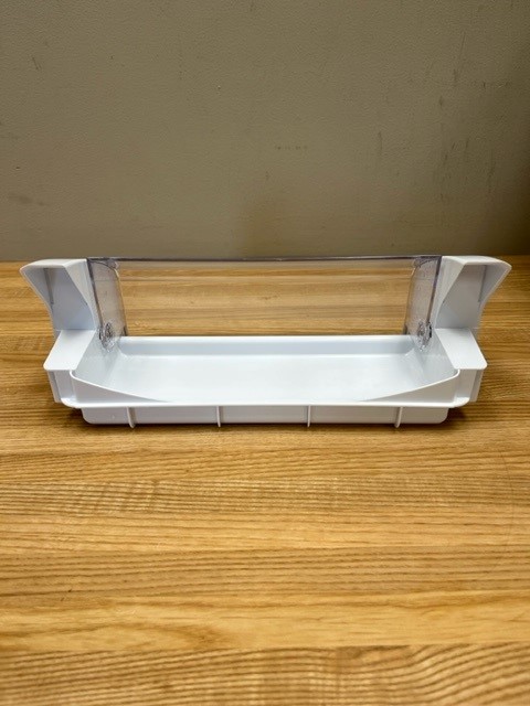 Refrigerator Door Bin with clear Dairy Door, which moves open and closed. White with Clear front. Found in 30″ French door Fridge about 21-22 cu.ft. in capacity.