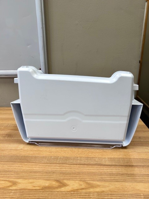 Refrigerator Door Bin with clear Dairy Door, which moves open and closed. White with Clear front. Found in French door Fridge on the right door.