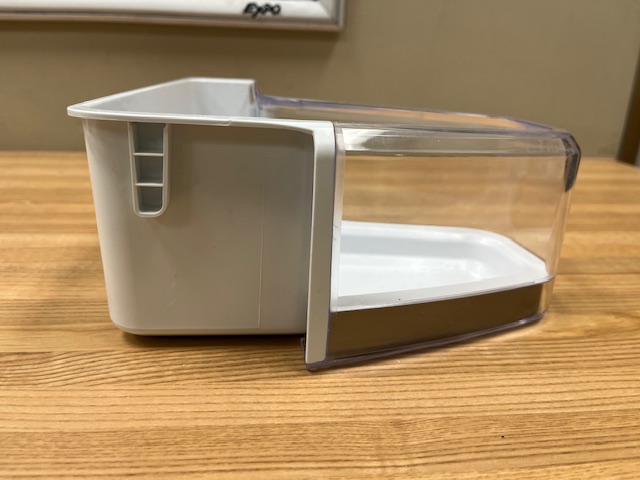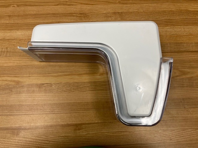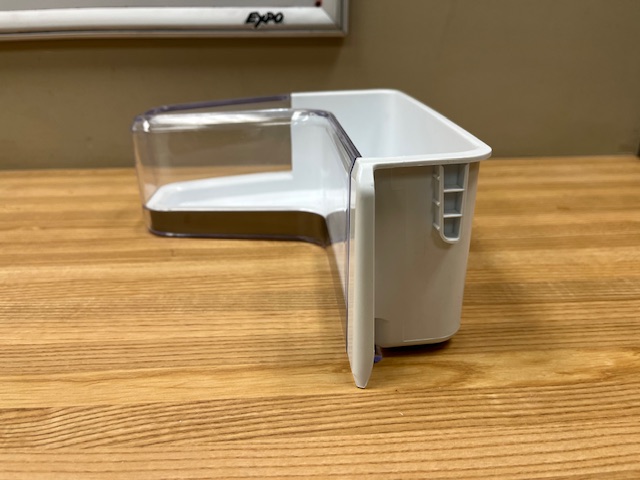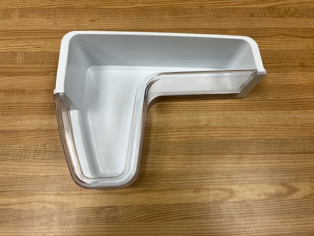 Refrigerator L-shaped door bin. White door bin with clear front. Door bin found in a French door fridge on the left side door.