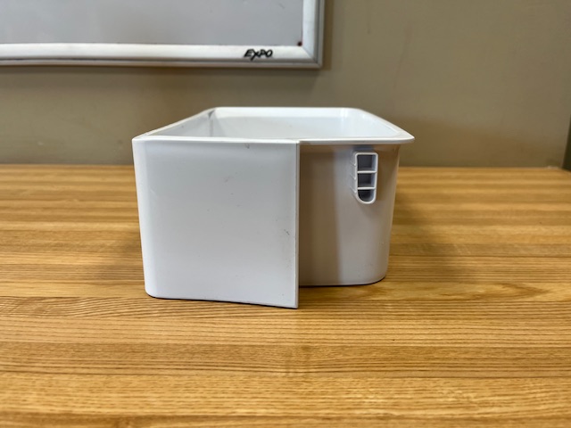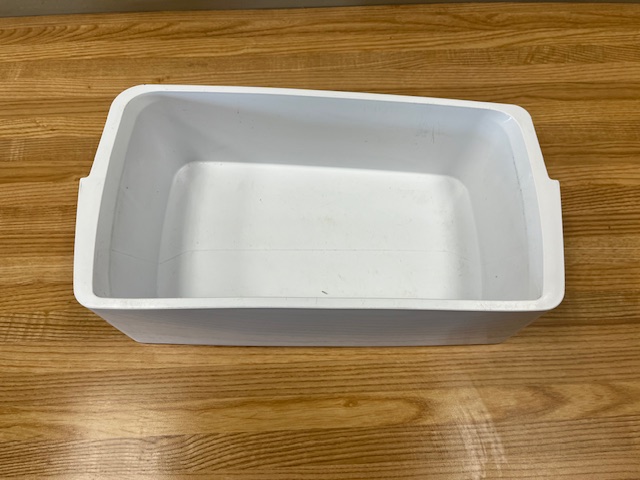 Refrigerator Door Bin. White in color. Door bin found on left side door of a French door fridge.