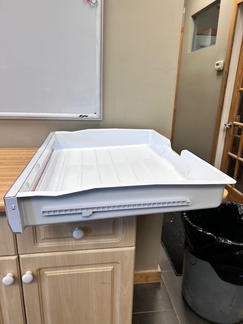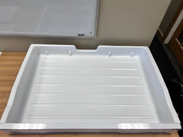 White Large pantry Drawer with Clear front found at the bottom of the fridge section in a 36″ wide French Door Fridge. Also known as Large Deli Drawer or “WideOpen CoolSelect Pantry” Drawer.