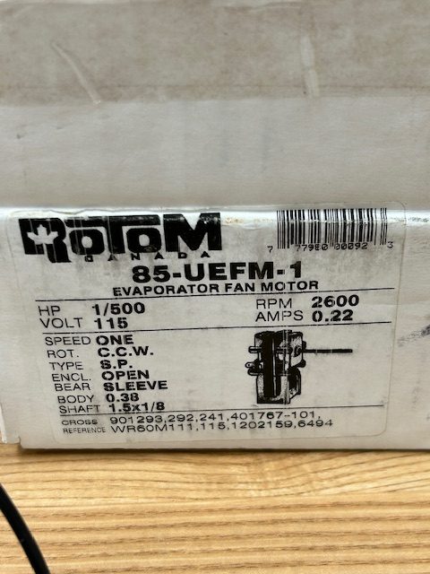 This kit includes the fan blade. This evaporator motor is located in the back of the freezer and circulates air over the coils. HP: 1, Watt: 500, RPM: 2600, Voltage: 115, Amps: 0.22, Speed: 1, Rotation: CCW, Shaft: 1-1/2″ x 1/8″, Mounting: Stud