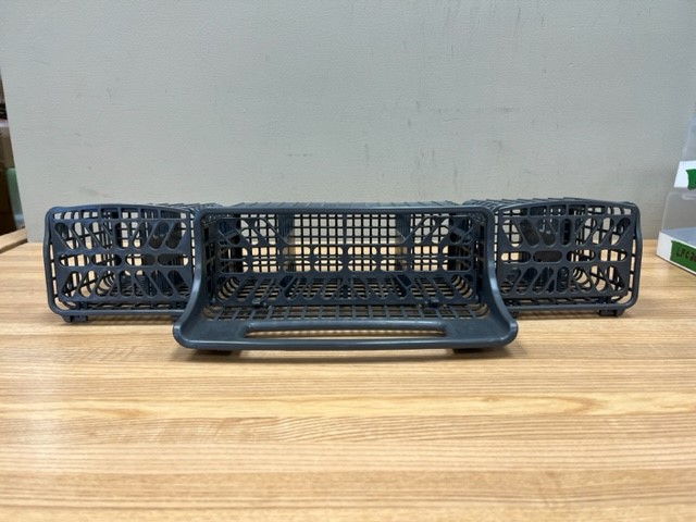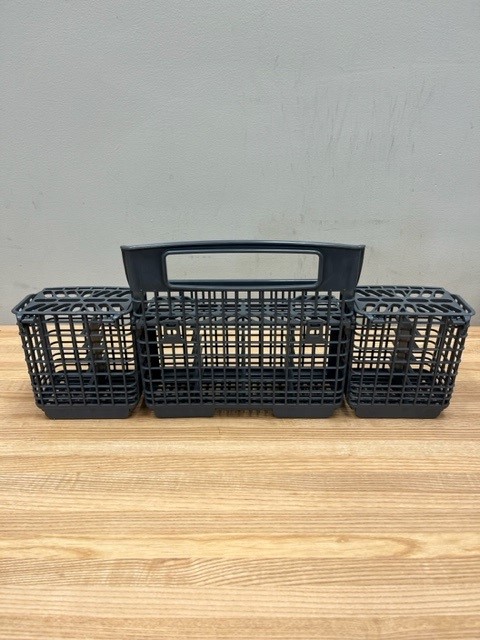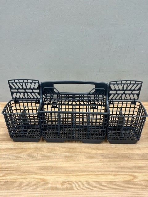Dark Grey in color. Dimensions (Approx.)- Width: 19 1/2″ depth: 4 1/4″ Height: 8 3/4 ” . This part is also known as a silverware basket. Sits in the Lower Dishrack and holds utensils for washing.
